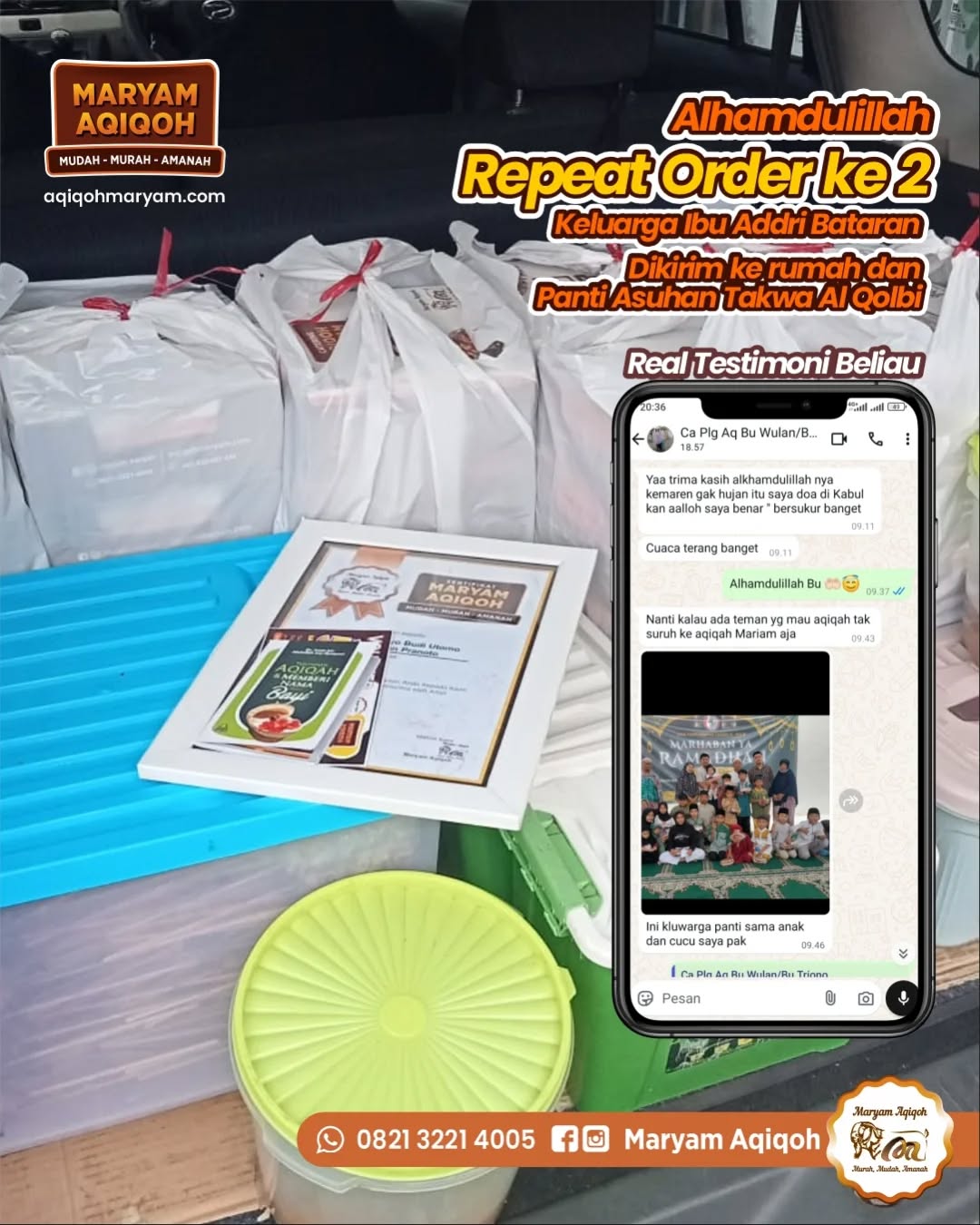 Maryam Aqiqoh memberikan gratis sertifikat aqiqah dengan bingkai premium, sehingga momen spesial buah hati menjadi lebih berkesan dan siap dijadikan kenangan indah keluarga.